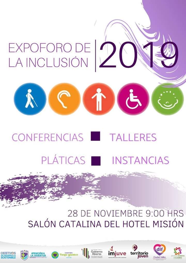 La Dirección de Atención a la Juventud en coordinación con el Sistema Municipal del DIF invitan a la población a la Expo Foro de la Inclusión 2019, la cual se desarrollará el 28 de noviembre a las 9 de la mañana en el salón Catalina. Andrés Vázquez Torres, titular de la dirección, explicó que esta Expo Foro incluye conferencias, pláticas y talleres, con la participación de diferentes escuelas que atienden casos de discapacidad. Indicó que habrá importantes charlas motivacionales. ¡La entrada es gratuita!
