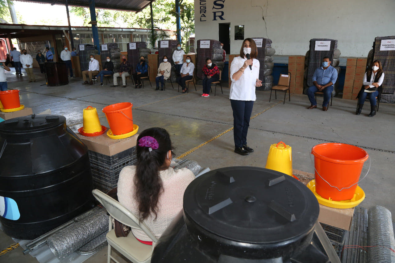 EN GIRA POR LA HUASTECA, LVR INAUGURÓ LAS INSTALACIONES DE LA UBR EN TANLAJÁS Y ENTREGÓ APOYOS DE DIF ESTATAL • Acompañada del Secretario de Educación también entregó equipo y mobiliario a planteles educativos. • Recibió reconocimiento por el apoyo al programa Ayuda que Cambia Historias del Cobach. • *Entregó apoyos en beneficio de población de 11 Municipios de la huasteca, así como a familias y figuras educativas de Conafe. En visita a los Municipios de Tanlajás y Ciudad Valles, la Presidenta de la Junta Directiva del Sistema Estatal para el Desarrollo Integral de la Familia (DIF), Lorena Valle Rodríguez, inauguró las instalaciones de la Unidad Básica de Rehabilitación de Tanlajás, además de entregar granjas avícolas de traspatio, bicicletas, apoyos alimentarios y cobijas del programa de Atención a Población en Condiciones de Emergencia (APCE) y paquetes para bebé en beneficio de familias y personas de 11 municipios de la huasteca. Como parte de sus actividades, también estuvo presente en la entrega de equipo y mobiliario a planteles educativos. Asimismo, recibió un reconocimiento por el apoyo que DIF Estatal brindó al programa Ayuda que Cambia Historias, para que estudiantes de comunidades recibieran paquetes de libros durante el presente ciclo escolar. Al iniciar sus actividades, acompañada por el Alcalde de Tanlajás Raúl Rivera Olvera; la Presidenta del DIF Municipal, Bertha Peñaflor Valdés; el titular de la SEGE, Joel Ramírez Díaz; y la Directora del DIF Estatal, Cecilia de los Ángeles González Gordoa; entregó granjas avícolas de traspatio a personas con discapacidad, bicicletas a estudiantes de comunidades y apoyos del programa APCE al DIF Municipal. También representantes de planteles educativos recibieron mobiliario y equipo. Posteriormente Lorena Valle Rodríguez, inauguró las nuevas instalaciones de la UBR Un Espacio de Esperanza, que ahora tendrá nuevos servicios con las áreas de hidroterapia, consultorios de psicología, terapia de lenguaje y atención médica. En su mensaje destacó el compromiso de las autoridades municipales para hacer posible tener unas nuevas instalaciones para la UBR. Asimismo, refirió que ahora las granjas se están entregando a personas con discapacidad, para brindarles una opción productiva. De igual forma, enfatizó la importancia del programa Una Bici con Rumbo para motivar a jóvenes a que sigan estudiando. Más adelante en Ciudad Valles, la Presidenta de la Junta Directiva, recibió un reconocimiento por parte del Colegio de Bachilleres, por el respaldo de DIF Estatal al programa Ayuda que Cambia Historias, que permitió a estudiantes de sistema Educación Media Superior a Distancia (EMSaD) contar con sus paquetes de libros y seguir con su formación educativa. Con la presencia de la Directora de Cobach, Marianela Villanueva Ponce, también recibieron reconocimientos las empresas GUSI y Praderas Huastecas. Por otro lado, en Ciudad Valles en reunión con Presidentas y Directoras de 11 DIF´s Municipales de la huasteca, les entregó apoyos alimentarios y cobijas del programa APCE. Asimismo, personas con discapacidad de Ciudad Valles y Tamuín recibieron paquetes para instalar granjas avícolas de traspatio. En tanto estudiantes de comunidades de 8 Municipios recibieron bicicletas, gestionadas a través del Voluntariado de la Oficina Regional 5. Finalmente, Lorena Valle Rodríguez acompañada por César Vázquez Jiménez, coordinador Territorial de Servicios Educativos del Consejo Nacional de Fomento Educativo (Conafe), entregó apoyos alimentarios y paquetes para bebé a familias que participan en programas del Consejo Nacional de Fomento Educativo (Conafe) y bicicletas a figuras educativas. Por otra parte, con la presencia del titular de la SEGE, docentes recibieron equipo y mobiliario para centros educativos de Ciudad Valles.