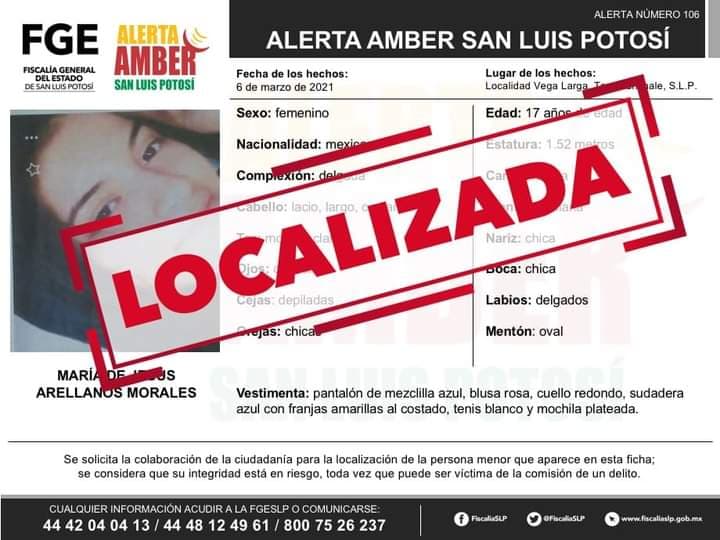 LOCALIZAN A JOVENCITA DE TAMAZUNCHALE QUE TENÍA ALERTA AMBER SLP. – Fue localizada sana y salva, la menor de nombre María de Jesús Arellanos Morales, por quien se activó una Alerta Amber para su localización desde el pasado 9 de marzo de 2021, informó la Fiscalía General del Estado de San Luis Potosí (FGESLP). La jovencita de 17 años de edad fue ubicada en el estado de Veracruz, por lo que se realizan los trámites para la devolución a su familia en Tamazunchale, municipio donde se reportó su ausencia. Se agradece a la población y medios de comunicación su apoyo en la difusión de la Alerta Amber, la cual contribuyó para dar con el paradero de la menor. Queda desactivada dicha búsqueda.