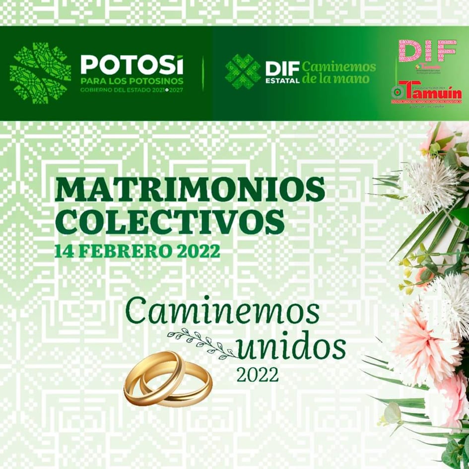 EL SMDIF Tamuín te invita a participar en los matrimonios colectivos del 3 de enero al 4 de febrero de 2022 en las oficinas del DIF Acudir en horario de 8:00 a 14:00 hrs. de lunes a viernes a llenar tu solicitud. La celebración colectiva: Se llevará a cabo el próximo 14 de febrero a las 12 hrs. Requisitos para ambos contrayentes: 1. Acta de nacimiento certificada. 2. Credencial de elector (INE). 3. Comprobante de domicilio. 4. Dos testigos por cada contrayente con copia de credencial de elector. 5. Certificado médico y resultados de análisis prenupciales.