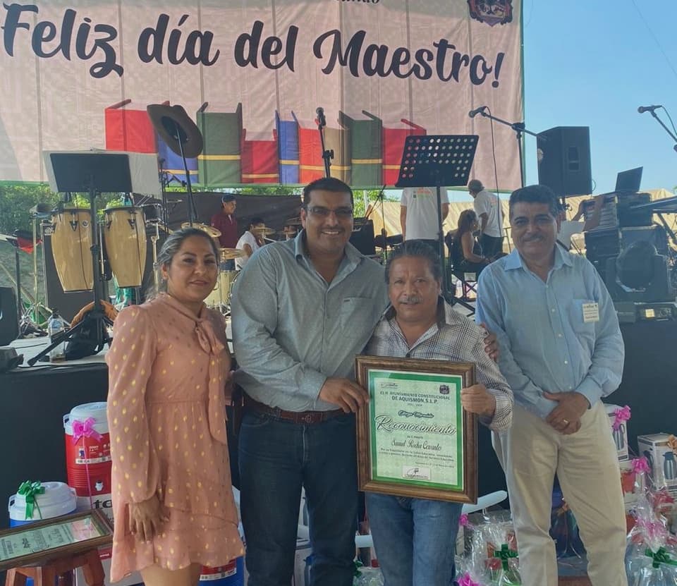 DE ESTUDIANTE A PRESIDENTE MUNICIPAL: REENCUENTRO DE TEMO CON SU MAESTRO “Él fue mi maestro”, expresó -sin ocultar la emoción- el presidente municipal Cuahutémoc Balderas Yáñez, cuando se enteró que pronto le entregaría al profesor Samuel Rocha Cervantes su reconocimiento por treinta años de servicio. Fue así como el festejo a los mentores en Aquismón agregó un detalle anecdótico y emotivo: El homenajeado pasó al frente al escuchar su nombre y recibió el documento enmarcado, firmado por su ex alumno, ahora alcalde. Balderas Yáñez no perdió la oportunidad para demostrarle su gratitud con un saludo fuerte, al que siguió un abrazo afectuoso; su esposa Angélica Acuña, y el jefe de telesecundarias Felipe Prado, atestiguaron el momento especial. DE ESTUDIANTE A PRESIDENTE MUNICIPAL: REENCUENTRO DE TEMO CON SU MAESTRO “Él fue mi maestro”, expresó -sin ocultar la emoción- el presidente municipal Cuahutémoc Balderas Yáñez, cuando se enteró que pronto le entregaría al profesor Samuel Rocha Cervantes su reconocimiento por treinta años de servicio. Fue así como el festejo a los mentores en Aquismón agregó un detalle anecdótico y emotivo: El homenajeado pasó al frente al escuchar su nombre y recibió el documento enmarcado, firmado por su ex alumno, ahora alcalde. Balderas Yáñez no perdió la oportunidad para demostrarle su gratitud con un saludo fuerte, al que siguió un abrazo afectuoso; su esposa Angélica Acuña, y el jefe de telesecundarias Felipe Prado, atestiguaron el momento especial.