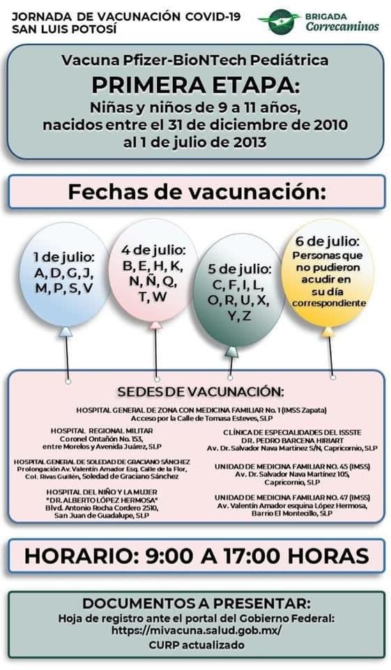 . Las sedes son el Hospital Regional Militar, Hospital del Niño y la Mujer, Hospital General de Soledad, la Clínica de Especialidades del ISSSTE Dr. Pedro Bárcena Hiriart y las Unidades de Medicina Familiar del IMSS No. 45 y No. 47, pueden acudir de las 9:00 A.M a las 17:00 P.M el 1 de julio se vacunará a niñas y niños con iniciales de apellido A, D, G, J, M, P, S V, el 4 de julio B, E, H, K, N, Ñ, Q, T, W, 5 de julio C, F, I, L, O, R, U, X, Y, Z y el 6 de julio personas que no pudieron acudir en su día correspondiente