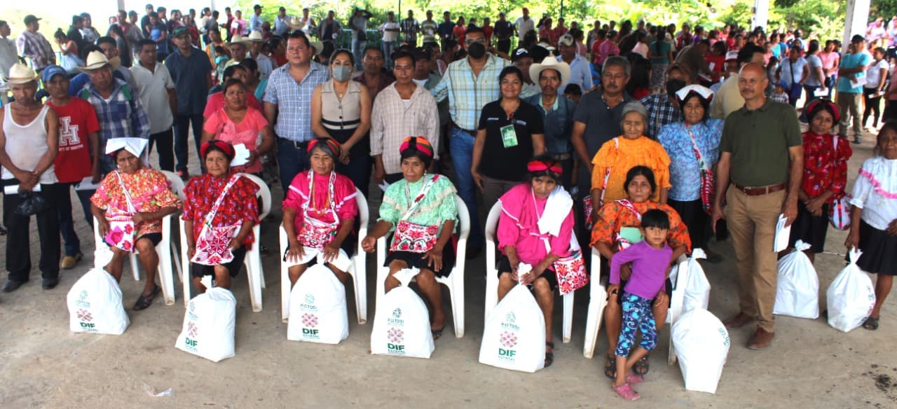 El alcalde Cuahutémoc Balderas Yáñez y funcionarios de la Secretaría de Desarrollo Social y Regional (Sedesore) y del Desarrollo Integral de la Familia (DIF), entregaron este viernes despensas a familias de casi una decena de localidades de Aquismón.