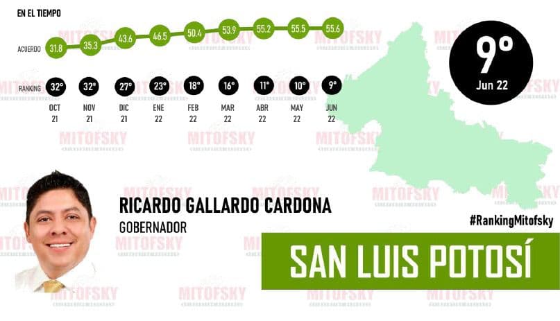 El ranking de Consulta Mitofsky “Gobernadores y Gobernadoras de México”, ubicó a Ricardo Gallardo Cardona, mandatario estatal de San Luis Potosí, en el top diez de quienes detentan los niveles más altos de aprobación ciudadana y es el que más rápido ha escalado en el listado, pues en sólo nueve meses pasó del lugar 32 al noveno.