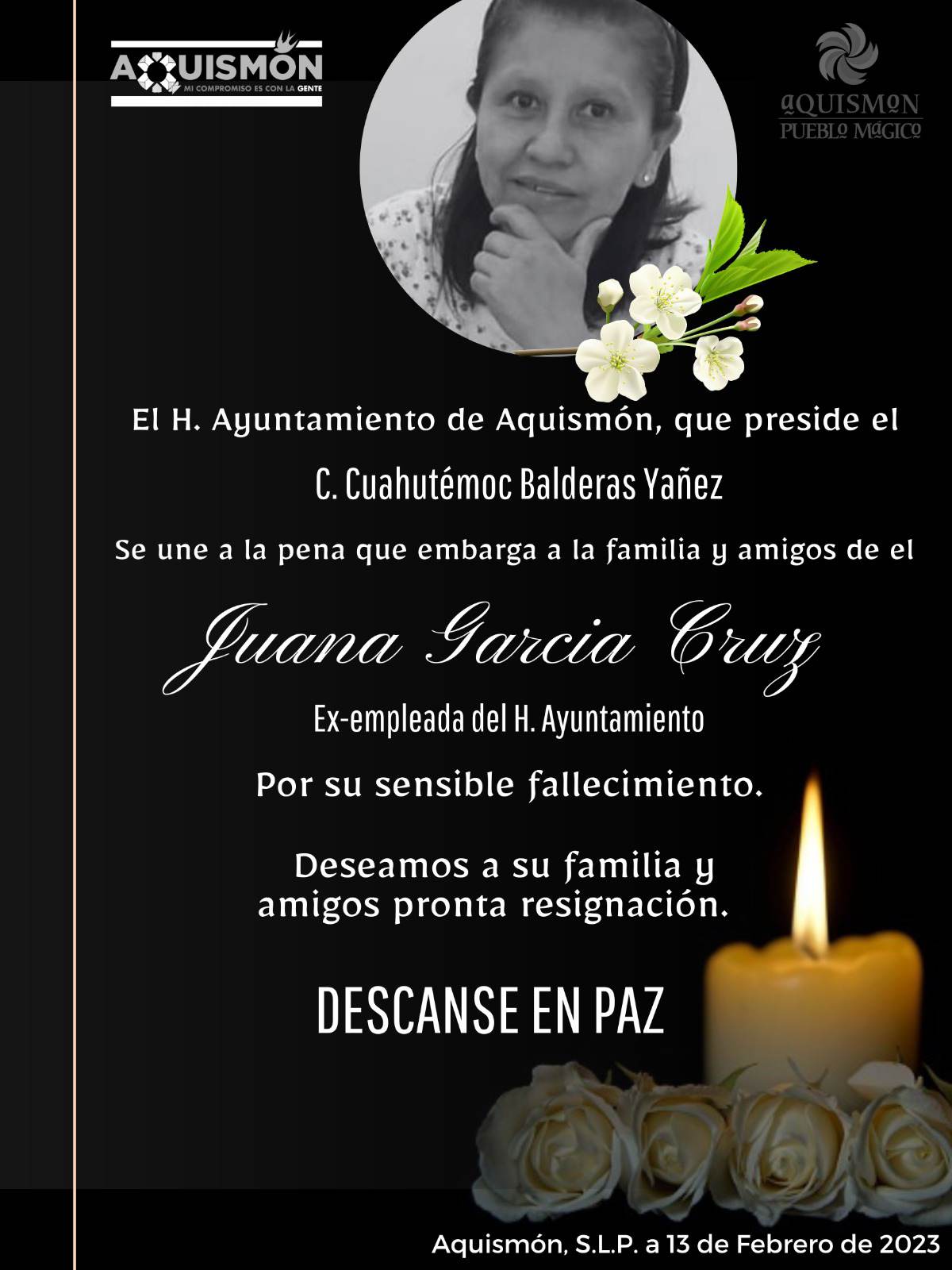 Luego de dirigir su mensaje –en el cual detalló las acciones de la última semana- el alcalde Temo Balderas honró de esta manera la memoria de la compañera Juana García Cruz, trabajadora del Ayuntamiento.