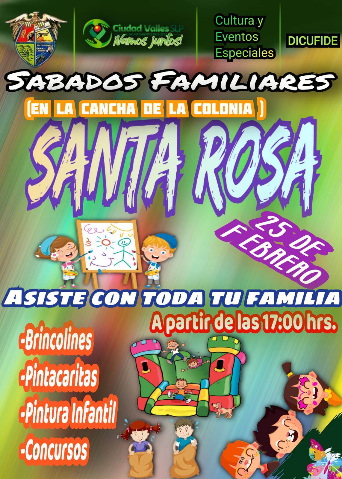 El Programa de Sábados Familiares, promovido por el Ayuntamiento de Ciudad Valles, a través de la Dirección de Cultura y Eventos Especiales, visitará esta semana la colonia Santa Rosa, para llevar a los habitantes de dicho sector actividades de sana convivencia.