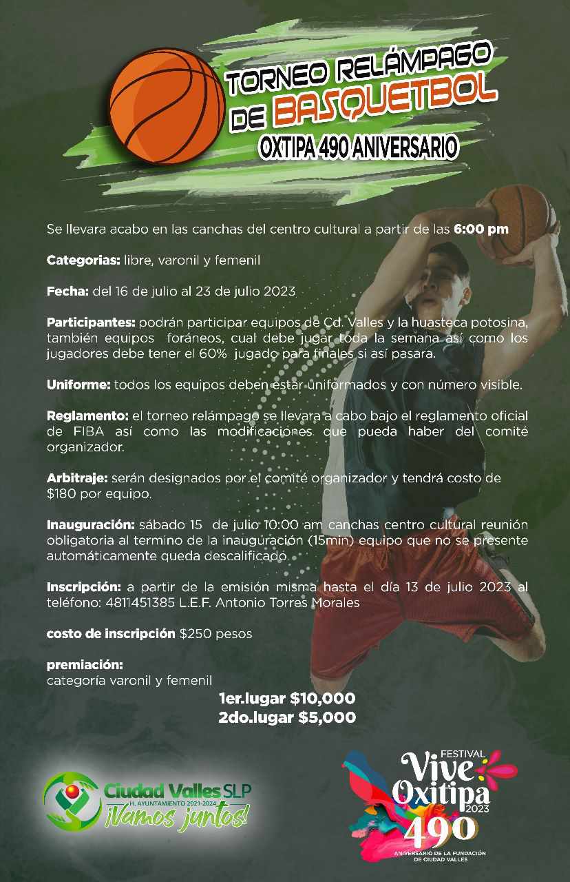 La coordinación general del festejo del 490 aniversario de la fundación del municipio de Ciudad Valles, invita a la población a participar en el Torneo Relámpago de Basquetbol, que se llevará a cabo del domingo 16 al domingo 23 de julio, a partir de las 6 de la tarde en las canchas del Centro Cultural, donde se podrá participar en la categoría libre, varonil y femenil.
