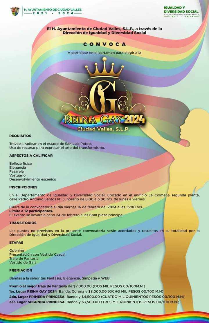 AYUNTAMIENTO DE CIUDAD VALLES CONVOCA AL CONCURSO REINA GAY 2024.