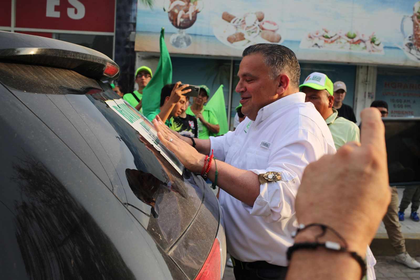 El candidato a la presidencia municipal saludó a la ciudadanía con una pega de calcas en la Avenida Hidalgo