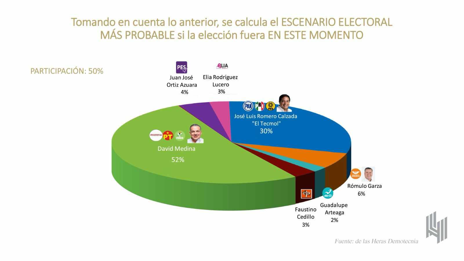Medina, quien busca la reelección en el cargo, supera casi al doble a José Luis Romero Calzada, candidato del PAN, PRI y PRD, al obtener el 30 por ciento; luego le sigue Rómulo Garza, de Movimiento Ciudadano, con el 6 por ciento; el candidato del Partido Encuentro Solidario, Juan José Ortiz Azuara con el 4 por ciento.