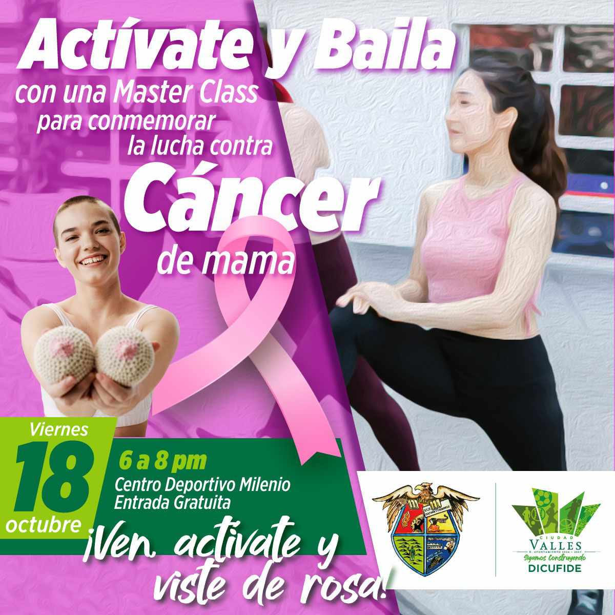En el marco de la conmemoración del Día Mundial de la Lucha Contra el Cáncer de Mama, la Dirección de Cultura Física y Deporte del H. Ayuntamiento de Ciudad Valles, invita a participar en la Máster Class de Zumba y Baile, que se llevará a cabo el próximo viernes 18 de octubre, de 18:00 a 20:00 horas, en el Auditorio del Centro Deportivo Milenio.