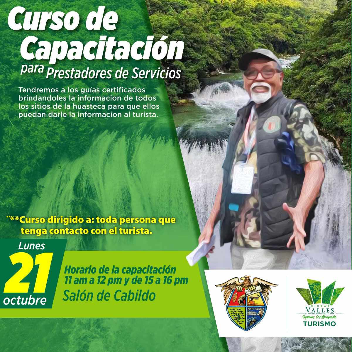 El H. Ayuntamiento de Ciudad Valles, a través de la dirección de Turismo, extiende la invitación a toda persona que se dedique a la prestación de servicios a recibir un curso gratuito de capacitación que se desarrollará el próximo lunes 21 de octubre, de 11:00 a 12:00 horas y de 15:00 a 16:00 horas.