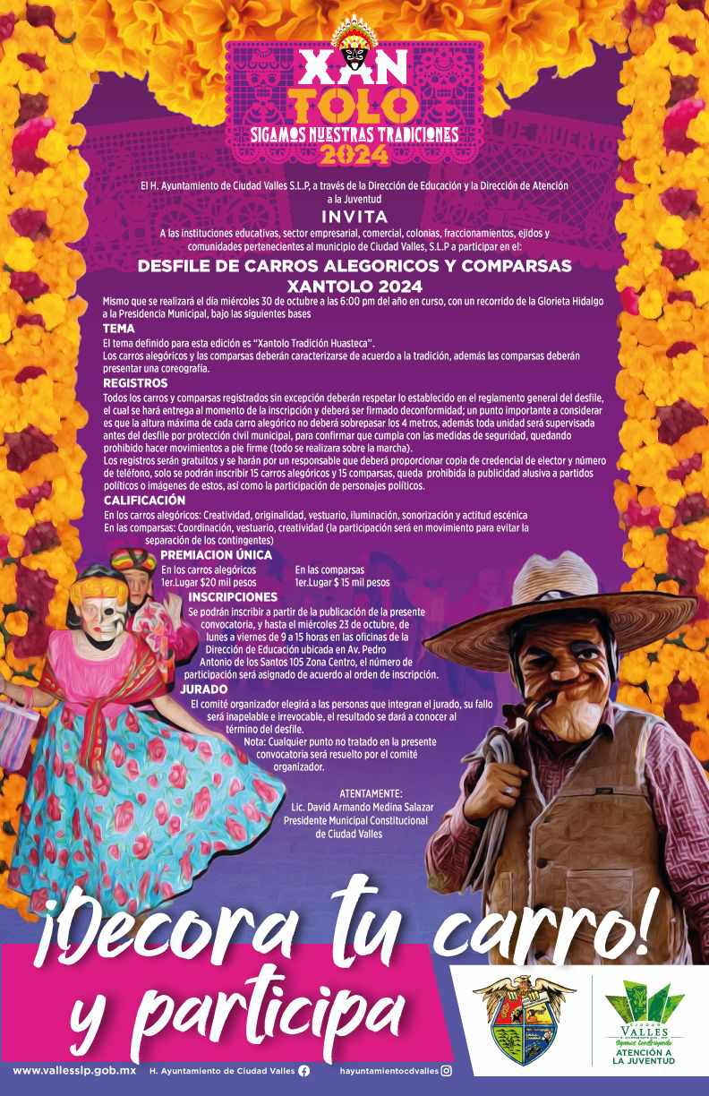 El H. Ayuntamiento de Ciudad Valles, a través de las direcciones de Educación y de Atención a la Juventud, invita a las instituciones educativas, al sector empresarial y comercial; así como a las colonias, fraccionamientos, ejidos y comunidades pertenecientes a Ciudad Valles a participar en el Desfile de Carros Alegóricos y Comparsas Xantolo 2024, mismo que se realizará el próximo miércoles 30 de octubre a las 18:00 horas.
