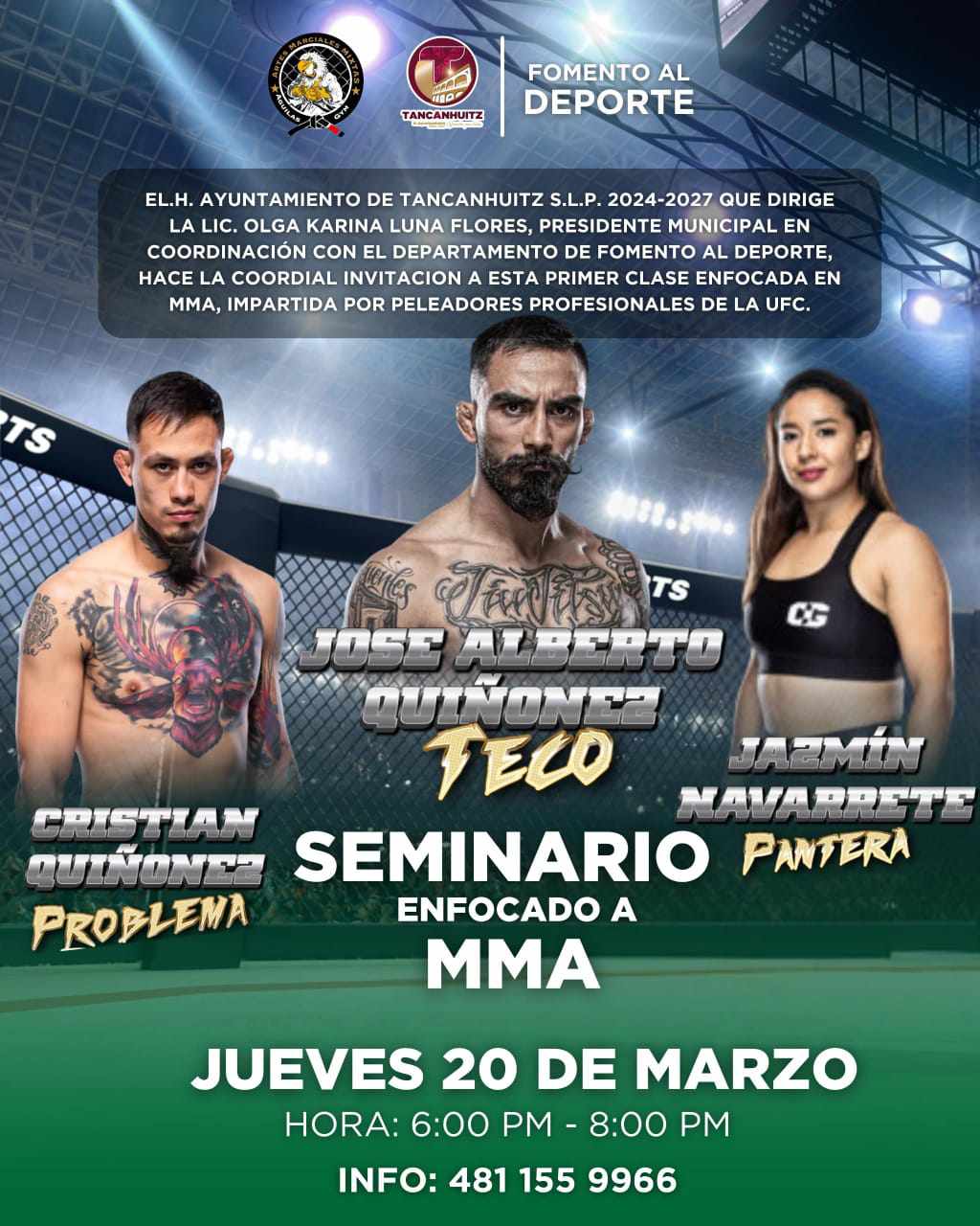 El H. Ayuntamiento de Tancanhuitz, encabezado por la Lic. Olga Karina Luna Flores, en coordinación con el director de Fomento al Deporte, Lic. Christian Espinosa Galván, invita a la ciudadanía a participar en la primera clase de MMA (Artes Marciales Mixtas) que será impartida por peleadores profesionales de la UFC.