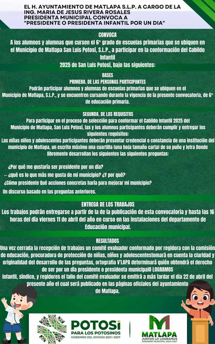 EL H. AYUNTAMIENTO DE MATLAPA S.L.P. A CARGO DE LA ING. MARIA DE JESUS RIVERA ROSALES PRESIDENTA MUNICIPAL CONVOCA A»PRESIDENTE O PRESIDENTA INFANTIL POR UN DIA»