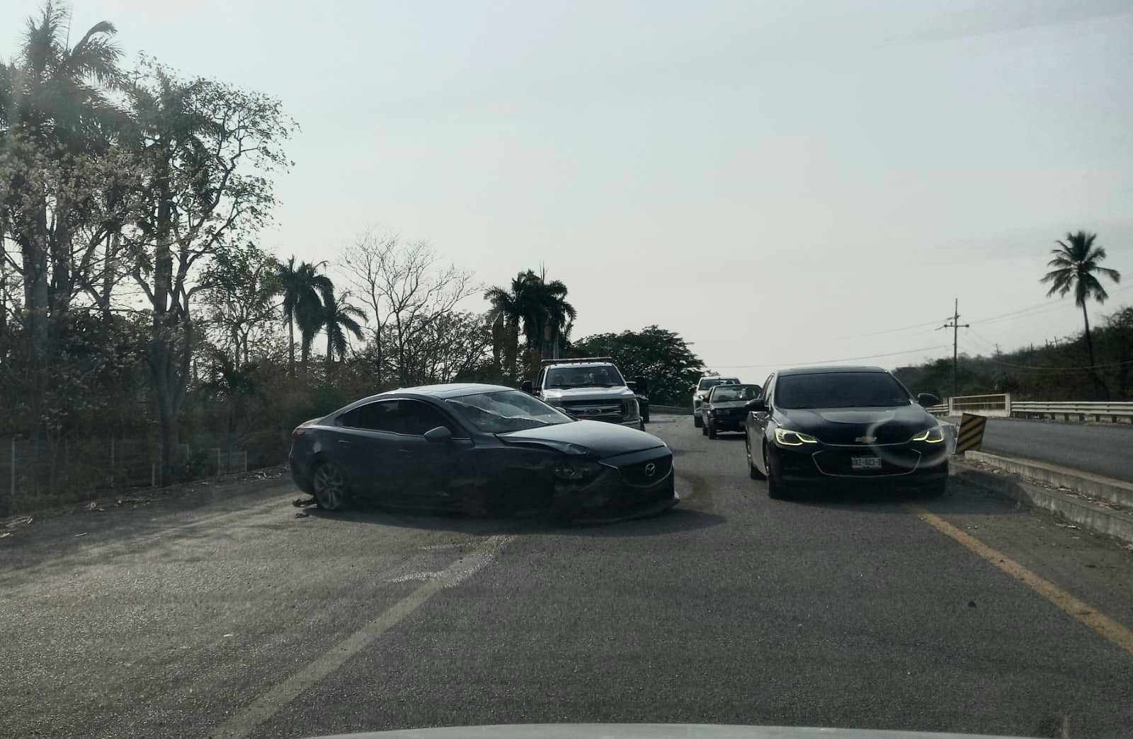 El indicente fue causado por el conductor de un Mazda color azul, el cual perdió el control de la unidad, golpeando con el muro de contención, por lo que terminó a media carretera sin 1 llanta.