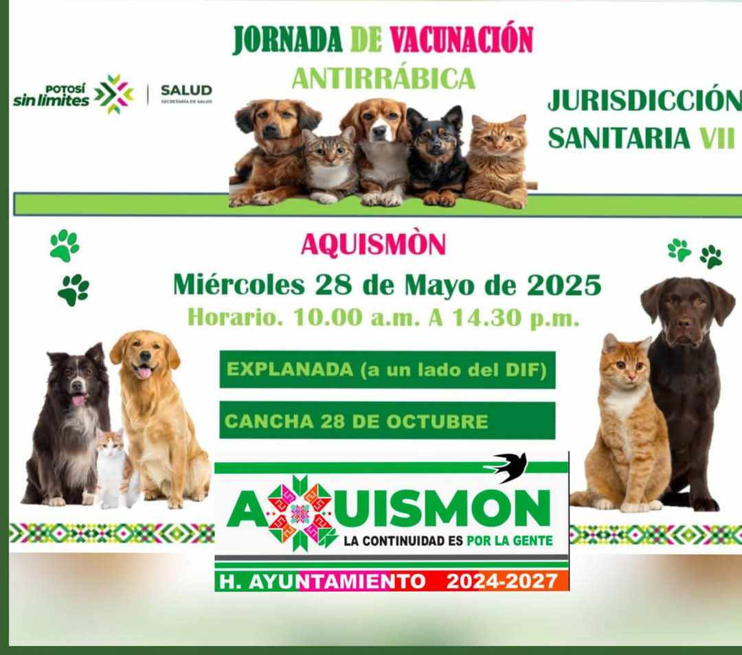 El Gobierno Municipal de Aquismón, que encabeza el Presidente Cuauhtémoc Balderas Yáñez, a través del Departamento de Fomento Agropecuario, hace una atenta invitación a la población para aprovechar la Jornada de Vacunación Antirrábica que se llevará a cabo este miércoles 28 de mayo, en coordinación con la Jurisdicción Sanitaria VII.