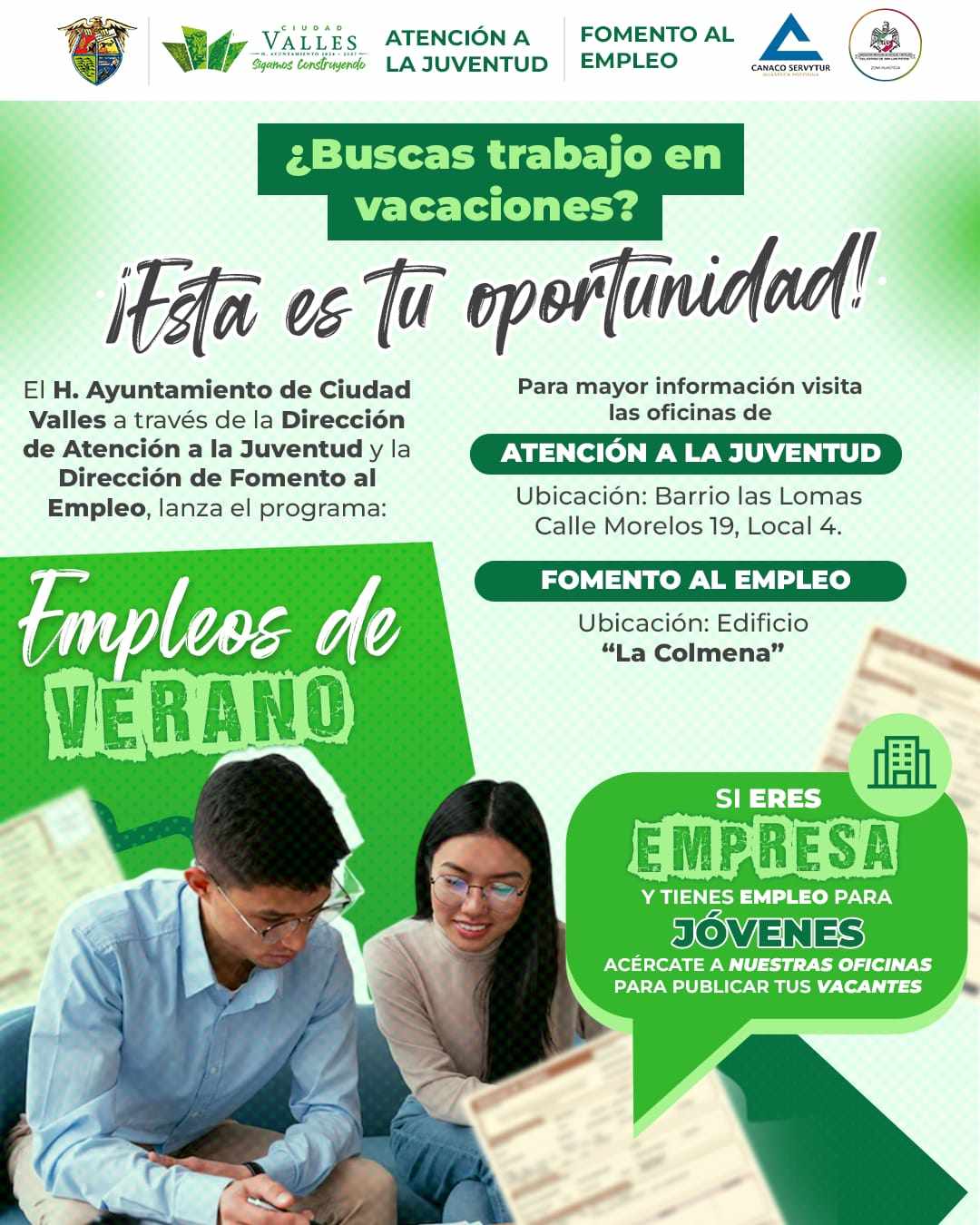 El H. Ayuntamiento de Ciudad Valles, a través de las direcciones de Atención a la Juventud y Fomento al Empleo, pone en marcha el programa “Empleos de Verano”, una estrategia pensada para ofrecer oportunidades laborales a jóvenes durante el periodo vacacional, con el objetivo de fomentar su desarrollo personal y profesional.