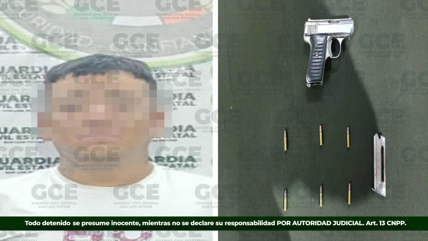Los dispositivos implementados por la Guardia Civil Estatal en la capital potosina, para que ti y tu familia sigan viviendo mejor, permitieron que se detuviera a Francisco “N” de 27 años, quien portaba un arma de fuego calibre .22, con un cargador y seis cartuchos útiles.