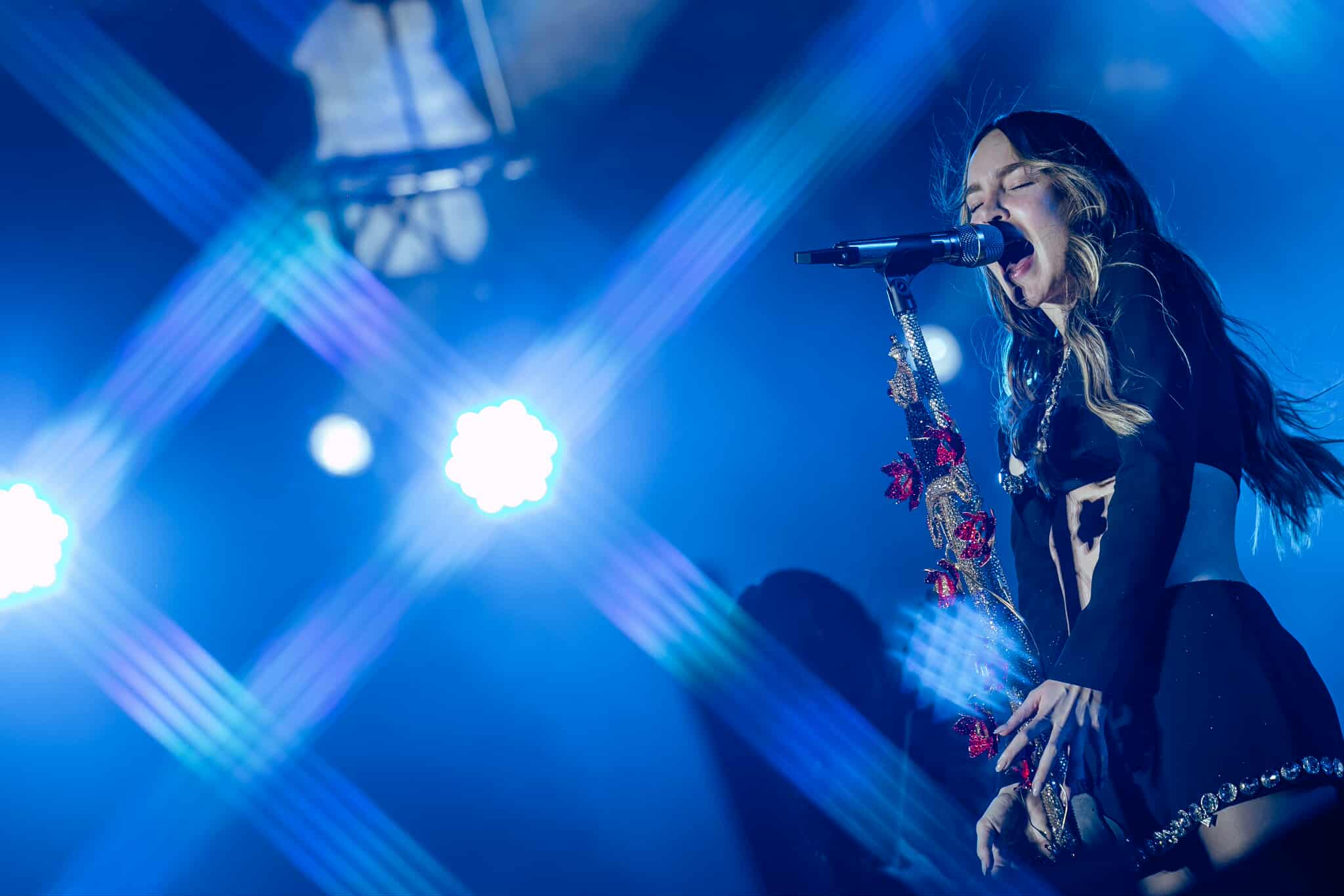 Ataviada con minifalda y top negros, lentes oscuros y unas imponentes alas, “La Beli” abrió con “Ángel”, para luego llevar la energía al máximo con “Lolita”, “Dopamina” y nuevos temas que hicieron vibrar a miles de asistentes. Desde el primer acorde, la conexión con el público fue total, logrando que cada canción se convirtiera en un coro multitudinario.