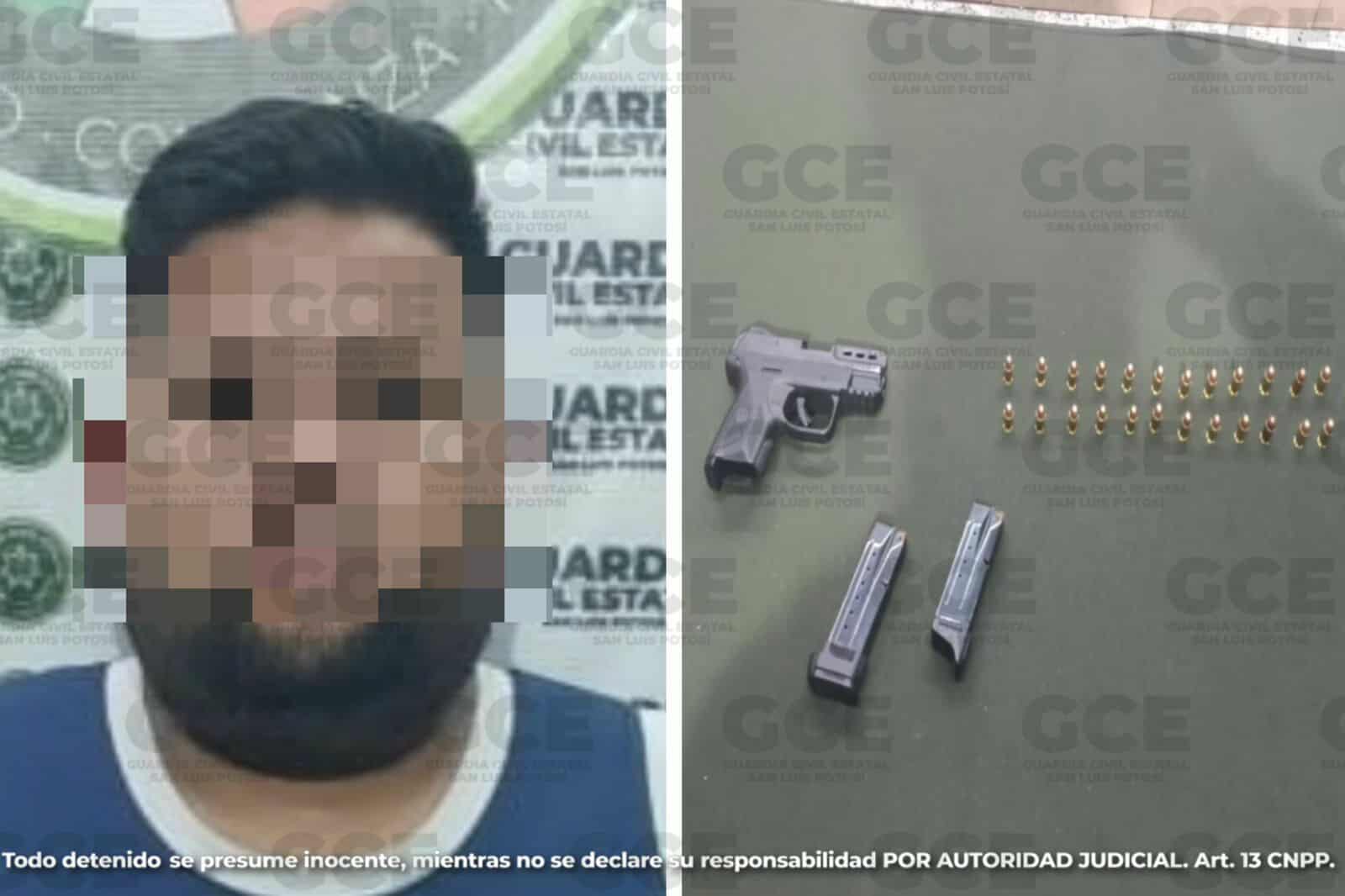 Los operativos de la Guardia Civil Estatal en el municipio de Cerro de San Pedro, permitieron la detención de Daniel “N” de 35 años, quien llevaba un arma de fuego calibre 380 milímetros, 25 cartuchos útiles del mismo calibre y dos cargadores.