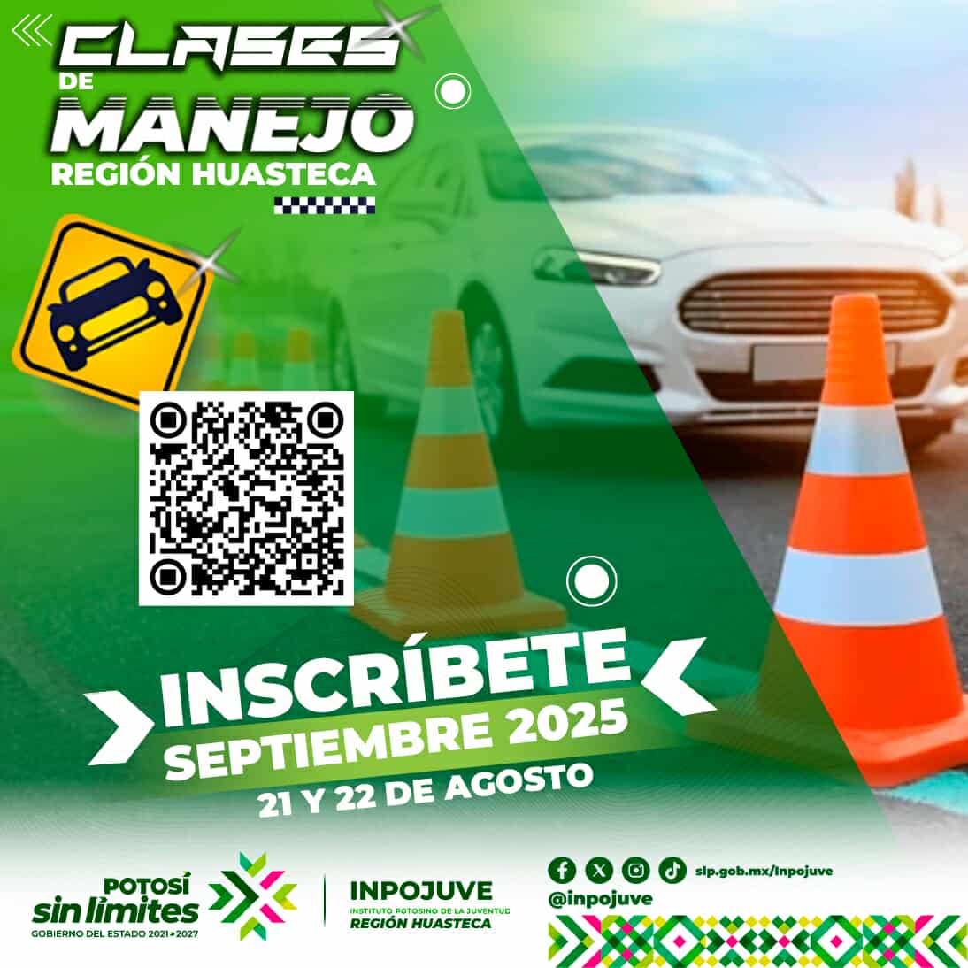 El Instituto Potosino de la Juventud (Inpojuve) abre inscripciones para los cursos de manejo a bajo costo de septiembre en la región Huasteca. El registro será el 21 y 22 de agosto en las oficinas del Inpojuve en Ciudad Valles.