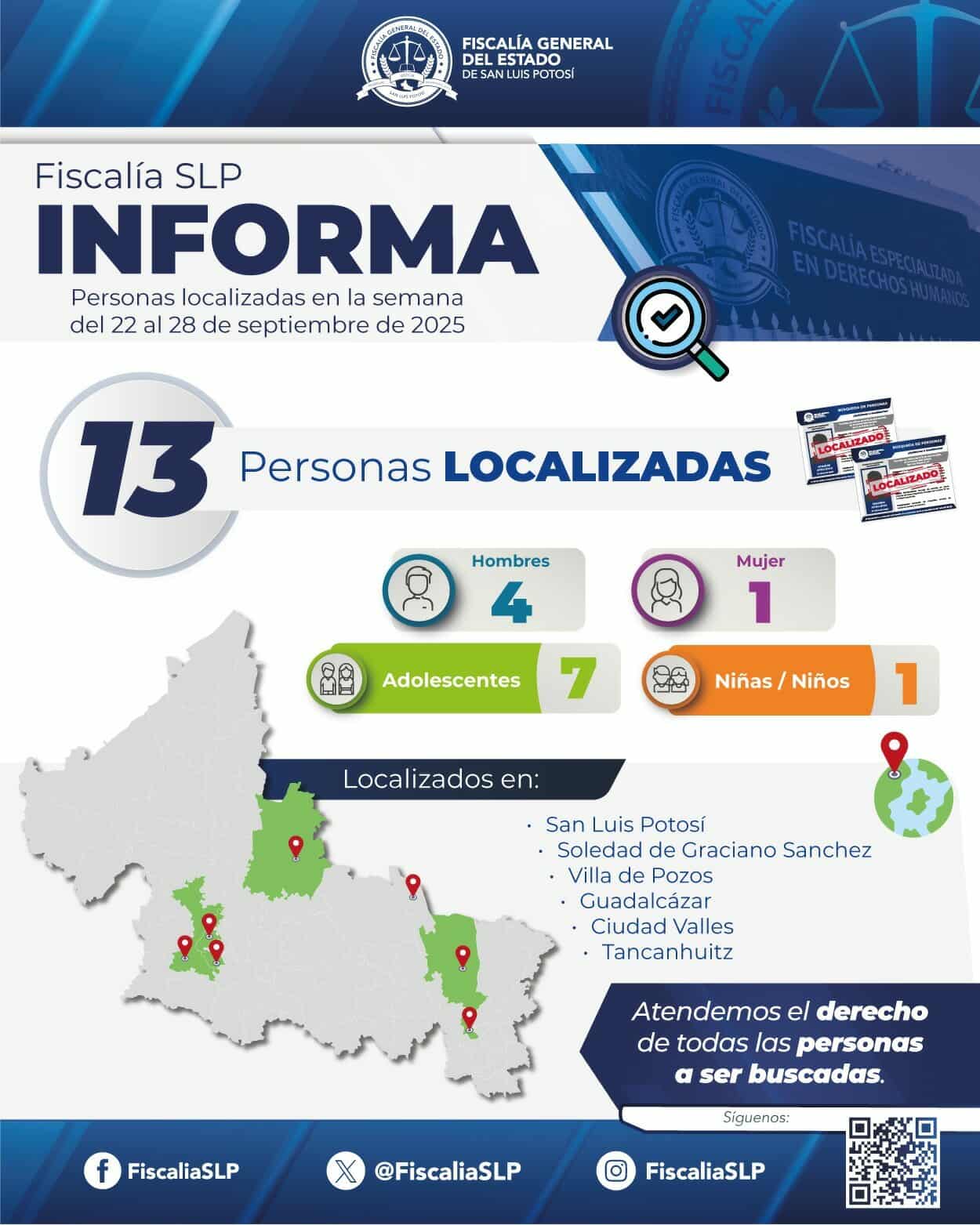 La Fiscalía General del Estado de San Luis Potosí (FGESLP) informa que, a través de la Fiscalía Especializada en Materia de Derechos Humanos y la Coordinación Estatal de Alerta Amber, fueron localizadas y reintegradas con sus familias 13 personas que contaban con reporte de desaparición en diferentes fechas y municipios de la entidad.
