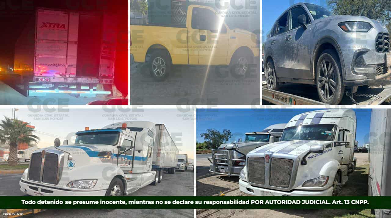Los operativos para combatir el robo de autotransporte de carga, arrojó la recuperación de cuatro unidades con reporte de robo en la carretera federal 57 a Matehuala, en el kilómetro 28, donde se recuperó un tractocamión Kenworth modelo 2013 color rojo con gris, un tractocamión modelo 2005 color blanco, un semirremolque caja seca Hyundai modelo 2014 y un tractocamión Kenworth modelo 2018 color blanco.