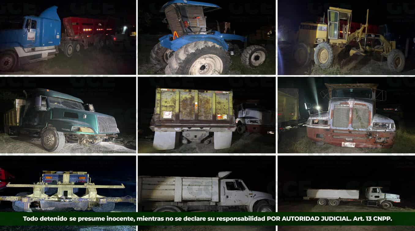 Los nueve vehículos asegurados son los siguientes: un vehículo Volvo, tipo volteo color amarillo con verde; un vehículo Kenworth, color blanco; un vehículo Freightliner, color blanco; un vehículo International tipo volteo color blanco; un vehículo Volvo tipo cisterna; un vehículo Freightliner, color azul; un vehículo tipo góndola color rojo; un tractor agrícola color azul marca Newholland y una máquina tipo moto conformadora marca Caterpillar color amarillo.