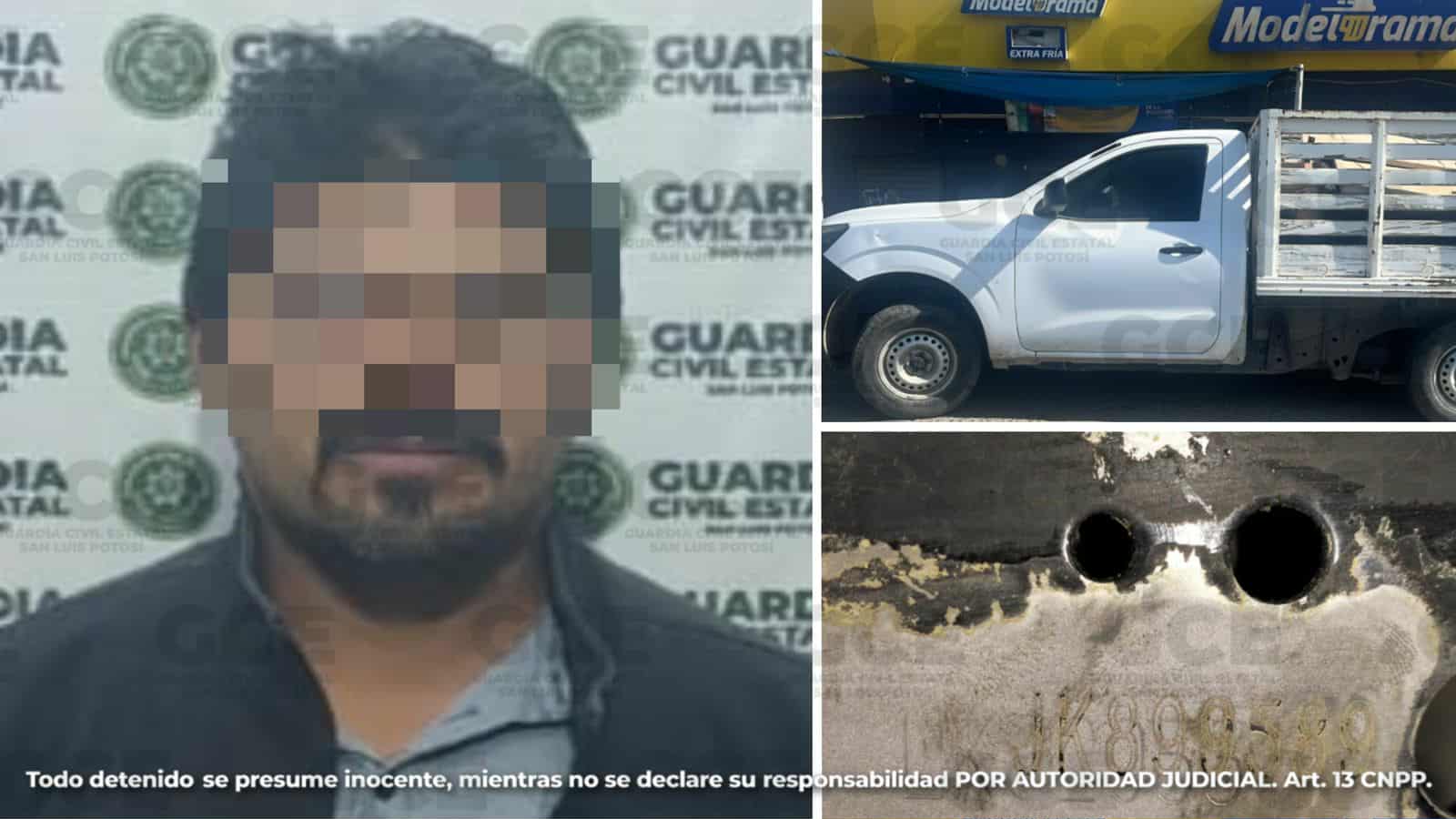 Durante un operativo realizado en el municipio de Mexquitic de Carmona, se detuvo a Emanuel «N» de 42 años, luego de asegurarle una camioneta Nissan, con un número de serie alterado, resultando con reporte de robo del Estado de México.