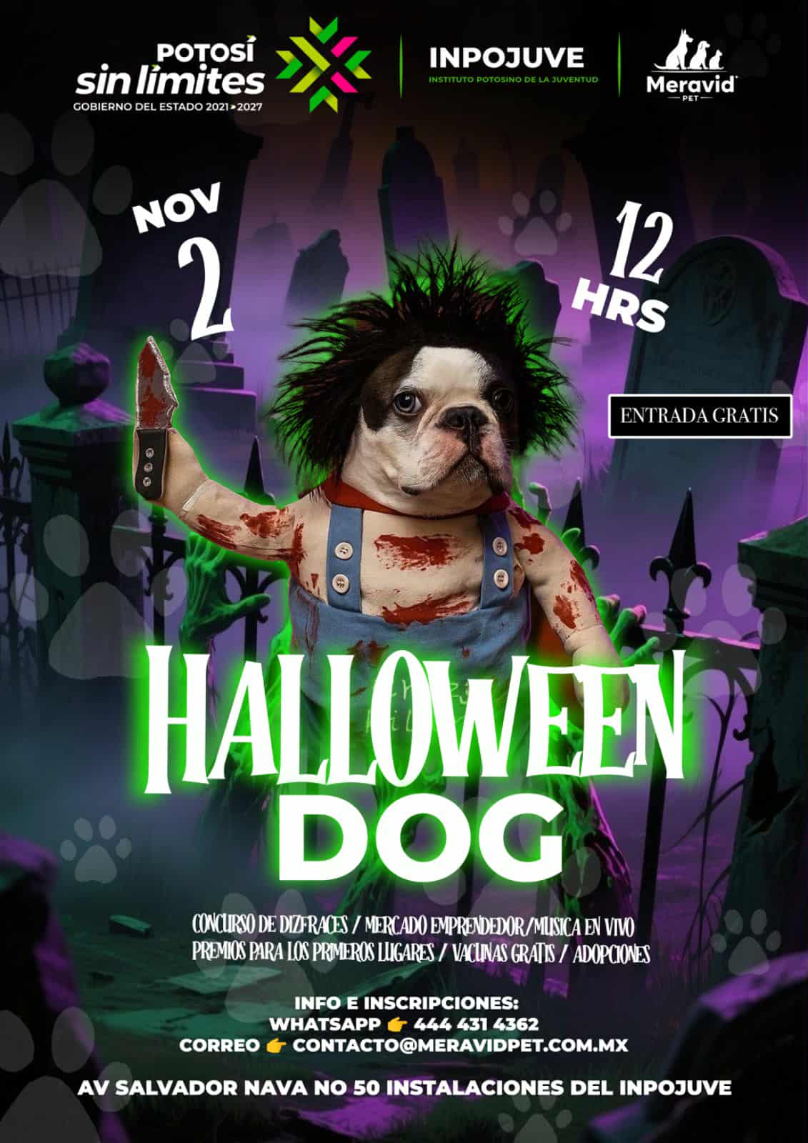 El Instituto Potosino de la Juventud (Inpojuve), en colaboración con Megavid Pet, realizará el concurso de disfraces canino “Halloween Dog” este domingo 2 de noviembre a las 12:00 horas, con entrada gratuita para jóvenes, familias y sus mascotas. El evento busca fortalecer la convivencia responsable, el cuidado animal y la participación social.