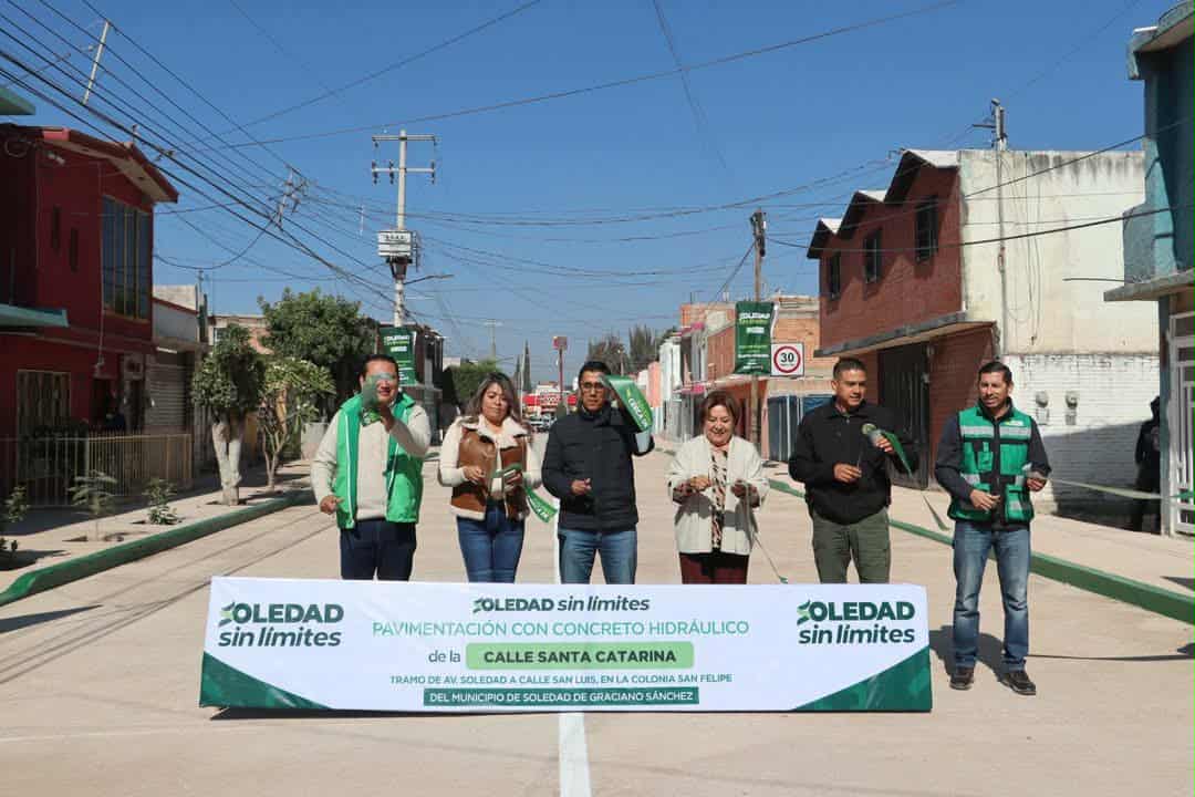 El municipio de Soledad de Graciano Sánchez avanza en su transformación urbana, con el compromiso firme del Alcalde, Juan Manuel Navarro Muñiz, de generar mejores condiciones de vida para todas las familias; al ser inaugurada la pavimentación con concreto hidráulico de la calle Santa Catarina en la colonia San Felipe, este martes, se reafirma el Plan de Urbanización que el Ayuntamiento ha emprendido en cada rincón del municipio, para brindar vialidades dignas, mayor movilidad, mejor seguridad pública y el incremento de la plusvalía en las viviendas.