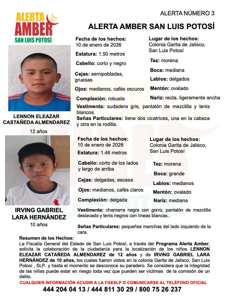 La Fiscalía General del Estado de San Luis Potosí (FGESLP), a través del Programa Alerta Amber, activó una ficha para la pronta localización de Lennon Eleazar Castañeda Almendarez, de 12 años de edad, e Irving Gabriel Lara Hernández, de 10 años, quienes fueron vistos por última vez el 10 de enero de 2026, en la colonia Garita de Jalisco, en la capital potosina.