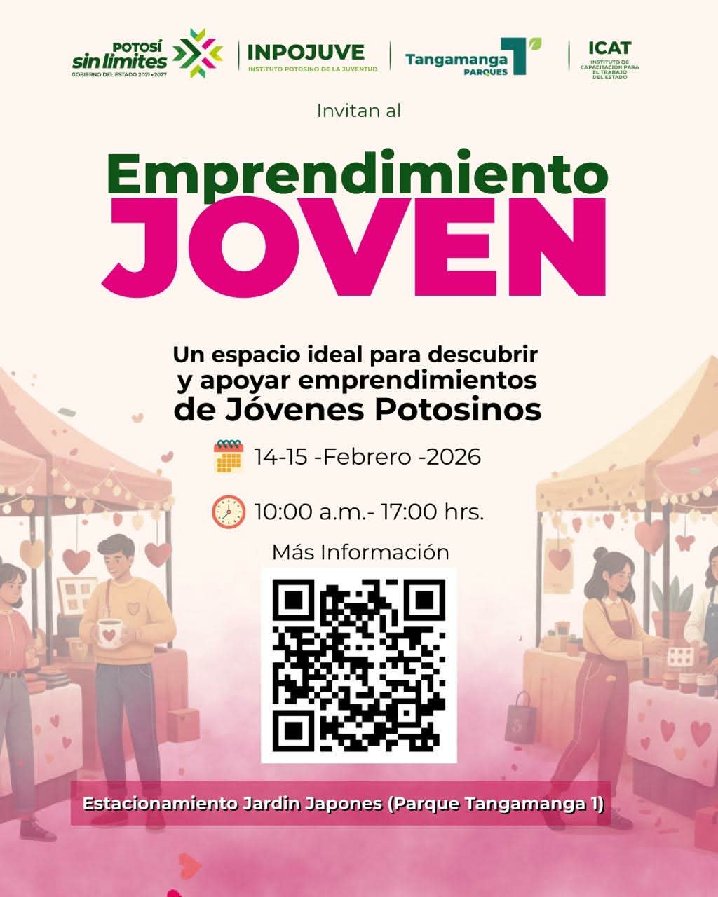 El Instituto Potosino de la Juventud (Inpojuve), en coordinación con los parques Tangamanga I y II y el Instituto de Capacitación para el Trabajo del Estado (Icat), invita a las y los jóvenes emprendedores potosinos a participar en un evento de emprendimiento juvenil que se realizará los días 14 y 15 de febrero.