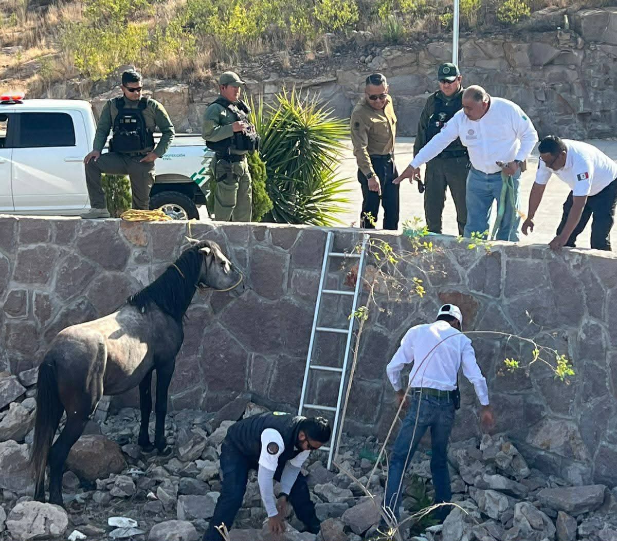 Durante las maniobras participaron la Coordinación Estatal de Protección Civil (CEPC) y la Guardia Civil Estatal (GCE), quienes actuaron con precisión y responsabilidad para liberar al equino y ponerlo a salvo, sin que se registraran riesgos mayores.