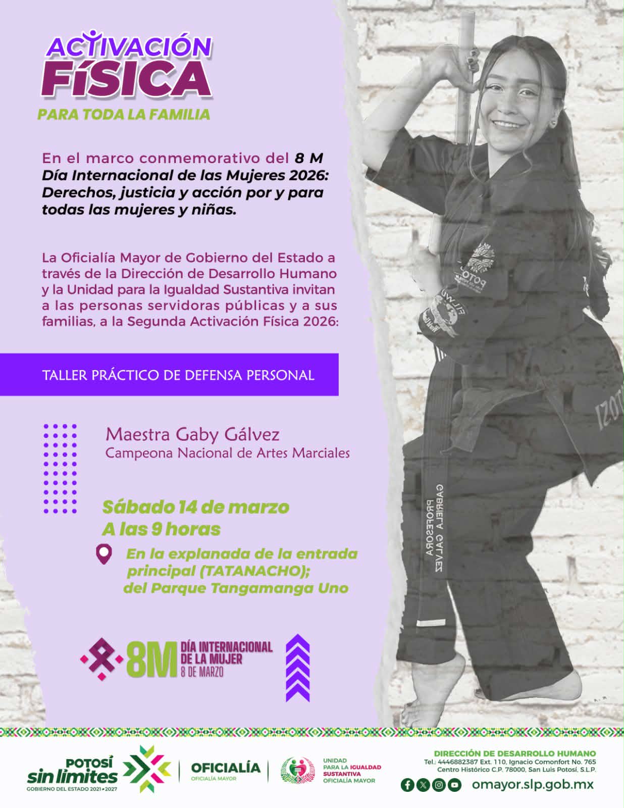 Como parte de las acciones que impulsa el Gobernador del Estado Ricardo Gallardo Cardona para promover el bienestar sin límites de las mujeres potosinas, la Oficialía Mayor (OM), a través de la Unidad de Igualdad Sustantiva, llevará a cabo la Segunda Activación Física 2026: Taller Práctico de Defensa Personal.