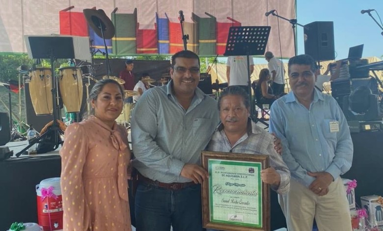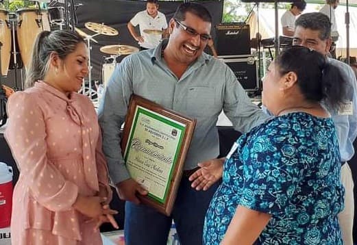 El presidente municipal Cuahutémoc Balderas Yáñez entregó el reconocimiento por sus 35 años de labor magisterial en Aquismón