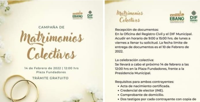 MATRIMONIOS COLECTIVOS EL 14 DE FEBRERO PROGRAMA GOBIERNO DE ÉBANO