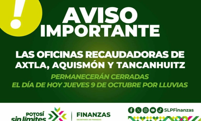 CIERRE TEMPORAL DE OFICINAS RECAUDADORAS EN TRES MUNICIPIOS DE LA HUASTECA POR LLUVIAS
