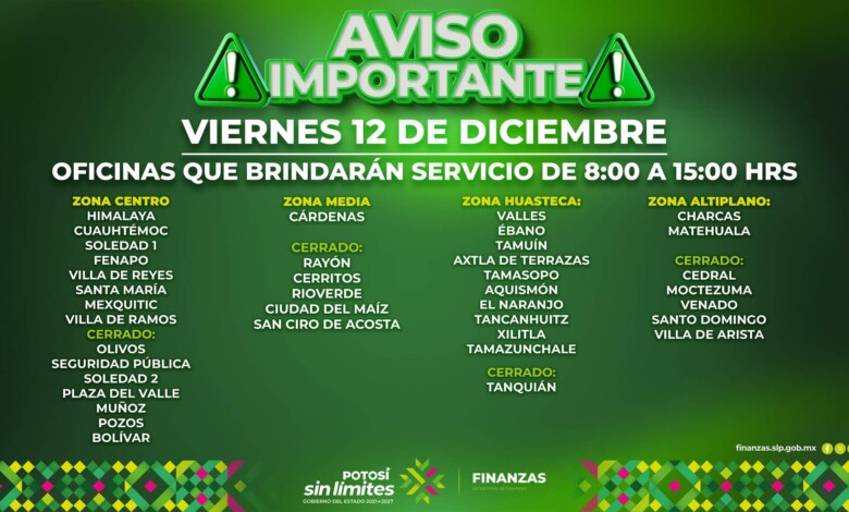 21 OFICINAS RECAUDADORAS DE FINANZAS BRINDARÁN SERVICIO EL 12 DE DICIEMBRE