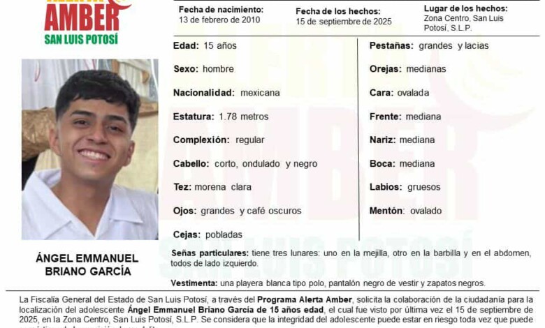 FISCALÍA ACTIVÓ UNA ALERTA AMBER PARA LOCALIZAR A UN ADOLESCENTE DE 15 AÑOS EN LA CAPITAL POTOSINA
